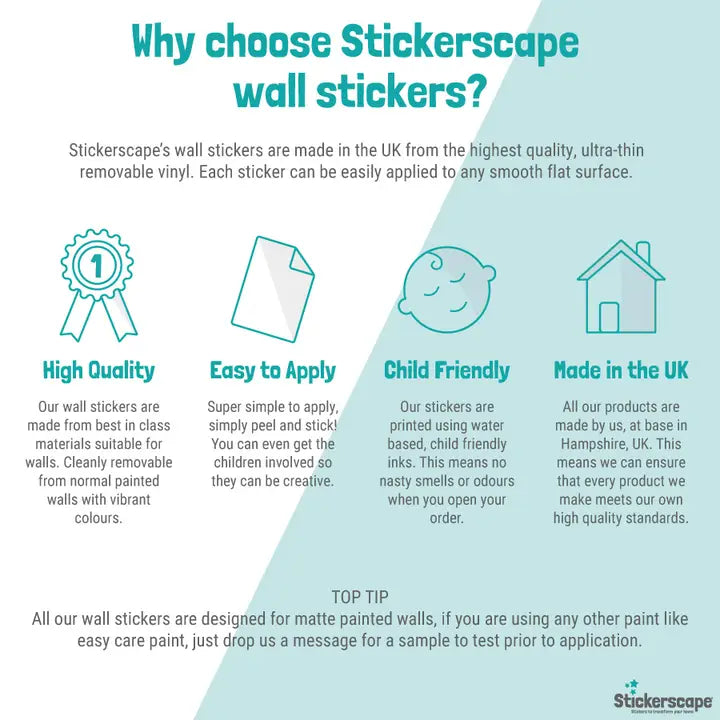 Stickerscape’s wall stickers are made in the UK from the highest quality, ultra-thin removable vinyl. Each sticker can be easily applied to any smooth flat surface (such as walls, doors, furniture and mirrors).